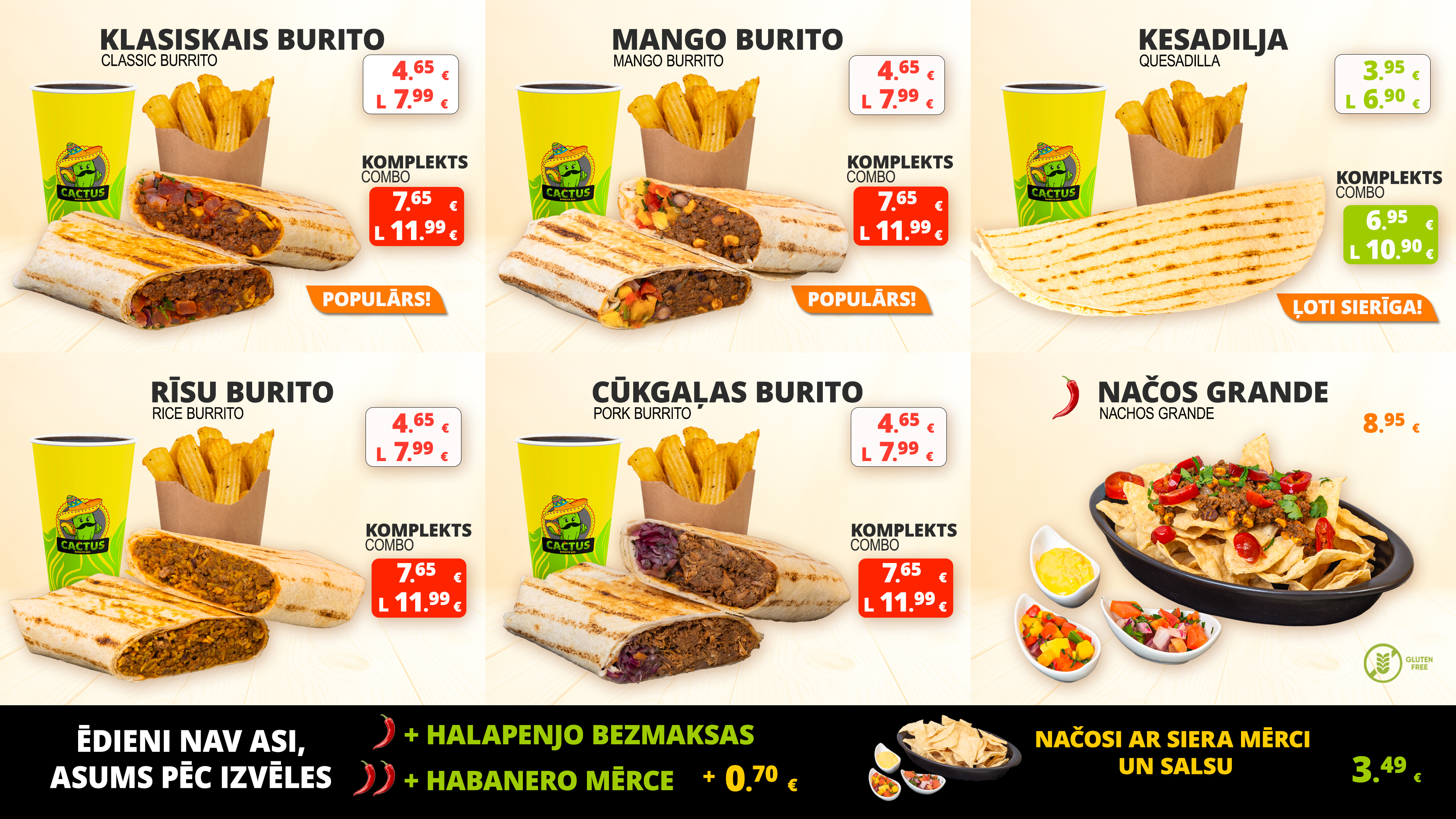 Cactus Burrito Bar serves Premium Mexican fast food built on freshness and quality. We use locally sourced Latvian beef, sea salt, and no palm oil in our products. Gluten-free options are available, all driven by one goal – honest flavor and uncompromising quality.